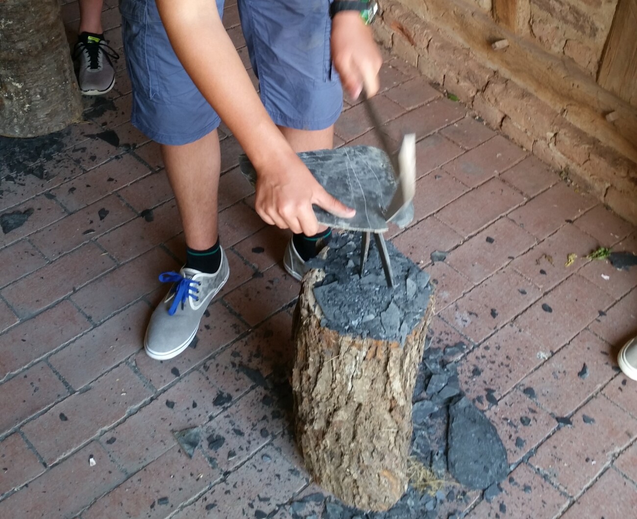 Schiefer als Bruchstein, Dach- oder Wandverkleidung war in weiten Regionen von Rheinland-Pfalz ein wichtiges Baumaterial, das jedem Dachdecker gut vertraut war. Mit Schieferhammer und Haubrücke werden Schieferstücke in Form gebracht. Anschließend werden für einen Aufsteller der Schieferplatte passende Holznägel mit dem Zugmesser an der Schnitzbank erstellt.