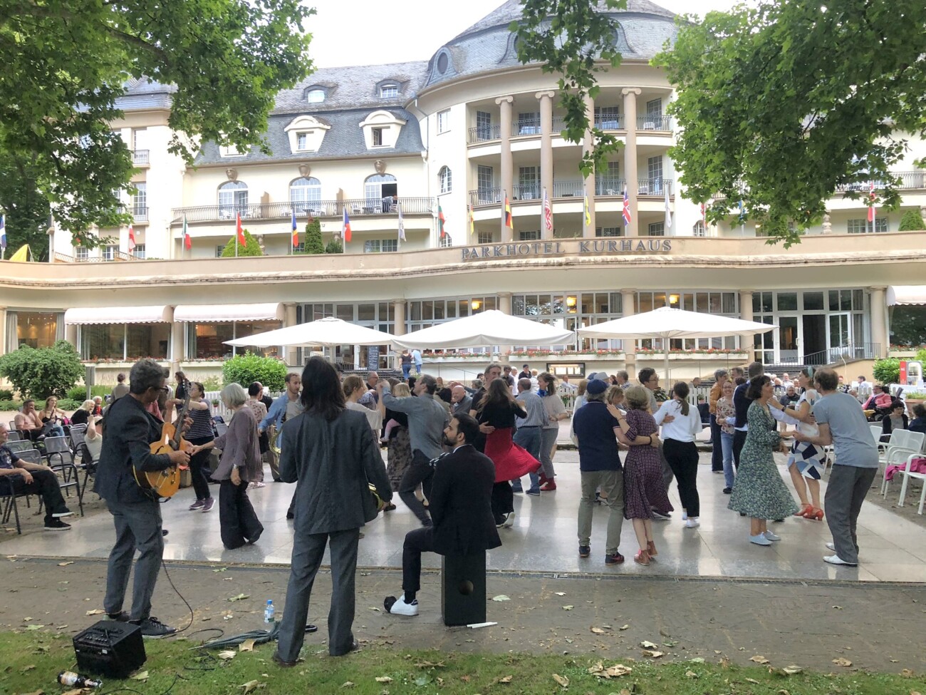 … und deshalb veranstaltet die Gesundheit und Tourismus GmbH bereits wie in den vergangenen zwei Jahren am Samstag, den 27. Juni 2026 von 15 bis 22 Uhr einen Tanztag mit fröhlicher Live Swing Musik auf der Tanzfläche vor dem Kurhaus in Bad Kreuznach. Um Spenden, um die aus Frankfurt angereiste Band zu finanzieren, sowie Beiträge für die Tanzkurse wird gebeten.