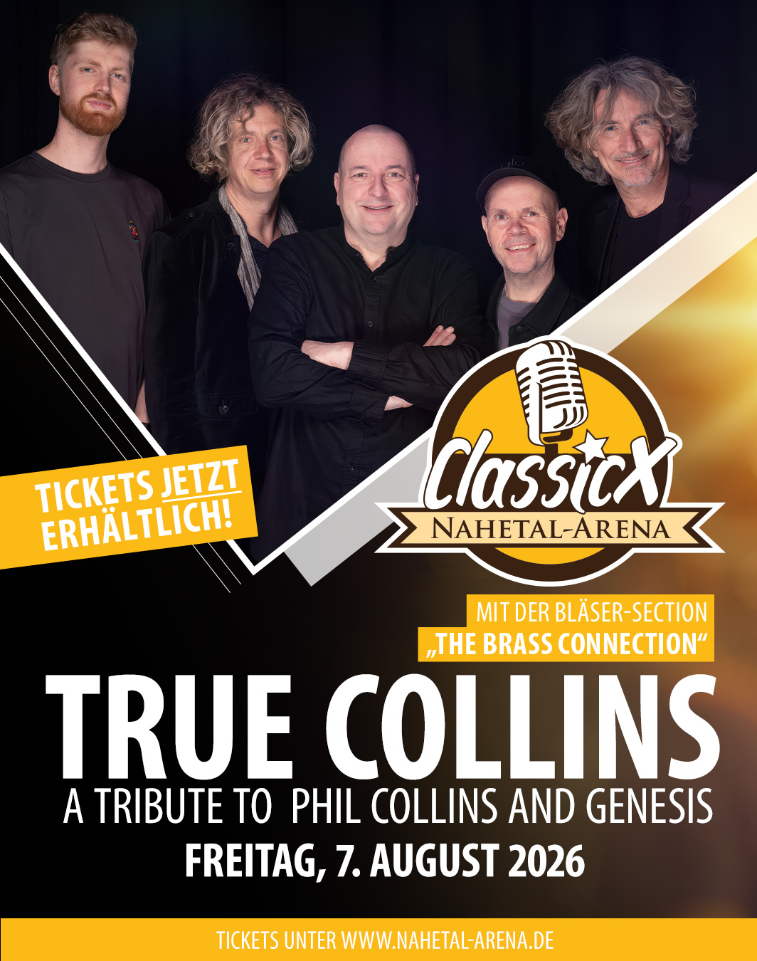Dass eine derart faszinierende Karriere musikalisch nachgezeichnet gehört, liegt auf der Hand. Diese anspruchsvolle Aufgabe erfüllt nun seit mehr als zehn Jahren die Phil-Collins- und Genesis-Tribute-Band TRUE COLLINS in beeindruckender Weise.